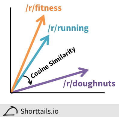/r/Fitness](http://www.reddit.com/r/Fitness" target="_blank) and [/r/running](http://www.reddit.com/r/running" target="_blank) are more similar to each other than to [/r/doughnuts](http://www.reddit.com/r/doughnuts" target="_blank) because the angle between them is smaller. Subreddit vectors can be added and subtracted as normal and then the angles recalculated to find the most similar subreddits to a combination.